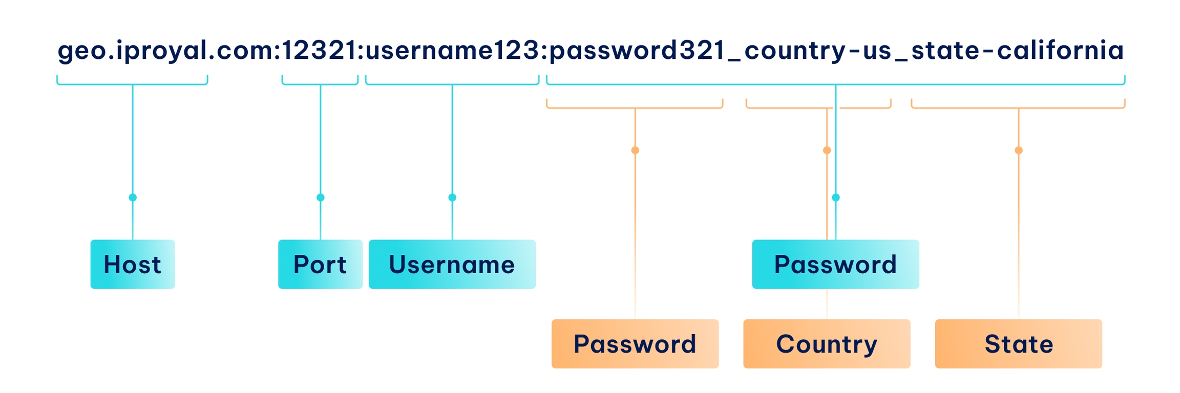 皇家住宅代理使用该字符串的密码段来配置上述设置。例如,以下是一个针对美国加利福尼亚州设计的代理字符串: