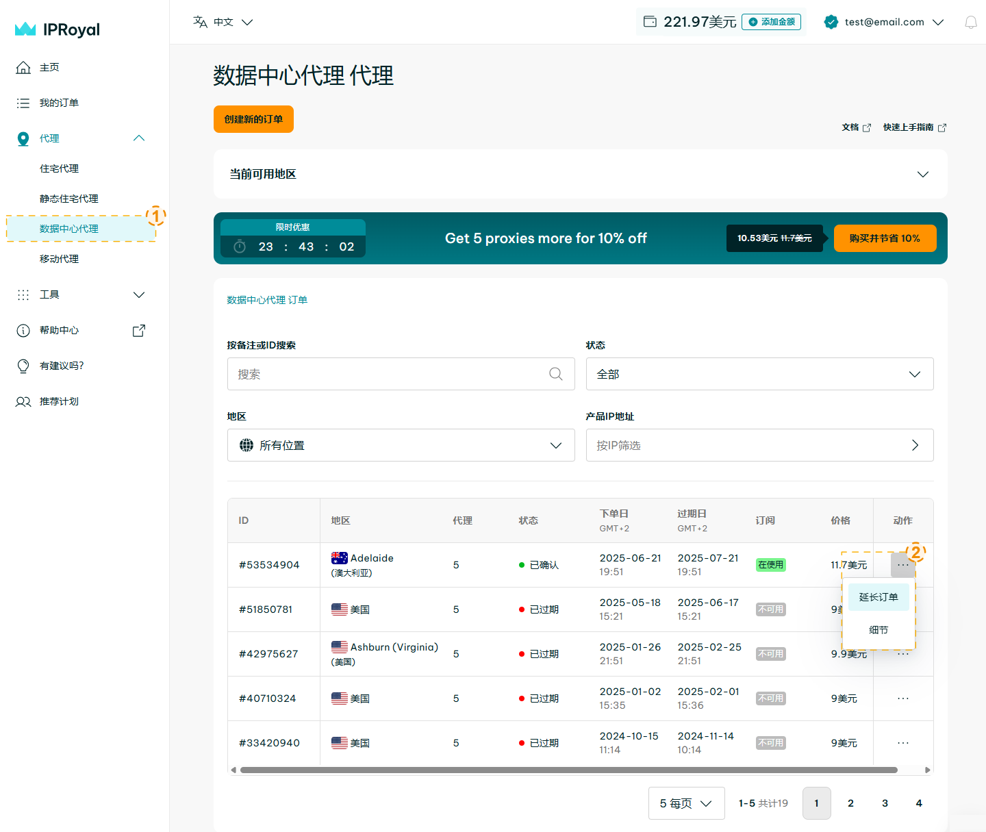 在续订订单时，您还可以选择更改套餐。例如，如果您最初选择了90天的套餐，但只需要将代理再多使用一天或一个月，您就可以在续订过程中相应地调整时长。订阅时也有同样的选项。